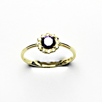 Zlatý prsten, žluté zlato, zirkon ametyst, čiré zirkony, T 1495