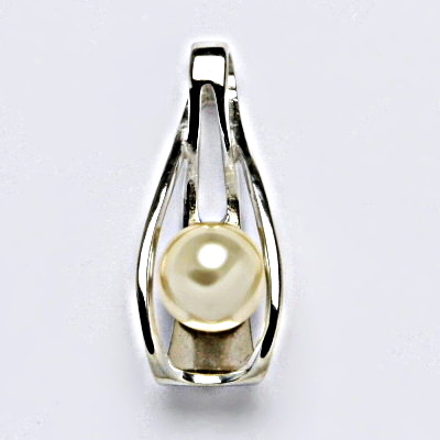 Stříbrný přívěšek s krémovou umělou perlou. Průměr umělé perly je 6 mm. Velikost přívěšku je 25 mm.