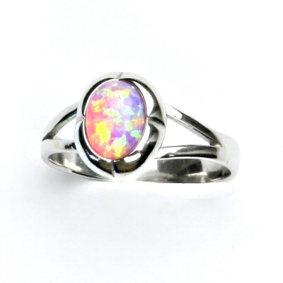 Stříbrný prsten zdobí syntetický opál velikosti 8 x 6 mm.