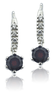 Zlaté náušnice na klasické patentové zapínání s čirými zirkony o průměru 1,4 mm a přírodním granátem o velikosti 4,75 mm