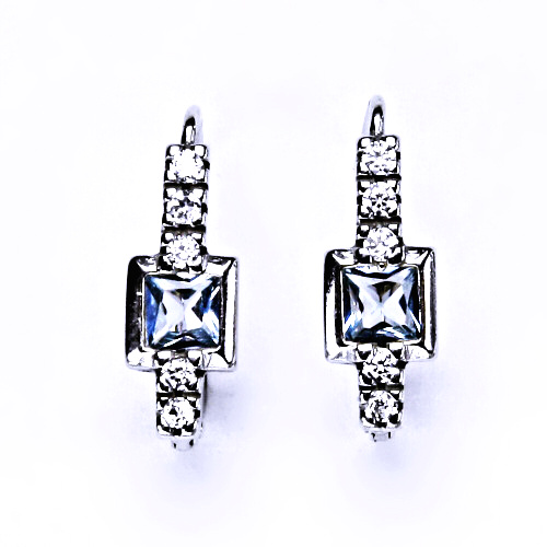 Dámské náušnice jsou vyrobeny z bílého zlata a jsou zdobeny zirkonem akvamarinem a čirými zirkony. Materiál náušnic je zlato 585/1000. Celková výška náušnice je 18 mm. Rozměr zdobné části je 15x6 mm. Náušnice mají zapínání na klapku.