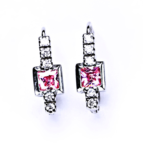Dámské náušnice jsou vyrobeny z bílého zlata a jsou zdobeny růžovým zirkonem a čirými zirkony. Materiál náušnic je zlato 585/1000. Celková výška náušnice je 18 mm. Rozměr zdobné části je 15x6 mm. Náušnice mají zapínání na klapku.