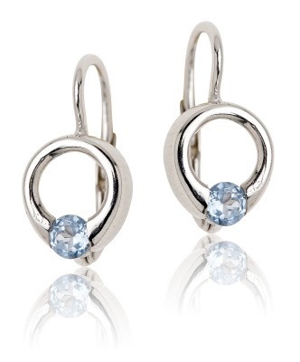 Náušnice z bílého zlata jsou zdobeny modrým zirkonem o průměru 3,5 mm. Materiál je zlato 585/1000. Orientační váha náušnic je 2,55 g. Celková výška náušnice je 17 mm. Šířka náušnice je 9 mm. Náušnice mají zapínání na klapku.