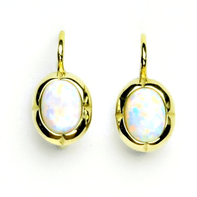 Zlaté náušnice na klasické patentové zapínání zdobí syntetický opál velikosti 8 x 6 mm .