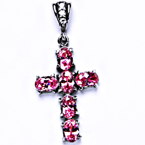 Zlatý přívěsek křížek osazený šesti růžovými zirkony .