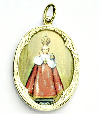 Zlatý přívěsek medailon, porcelánové Pražské Jezulátko, žluté zlato - P 158