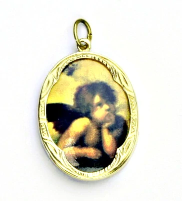Zlatý přívěsek medailon, porcelánový anděl, žluté zlato - P 158 A1