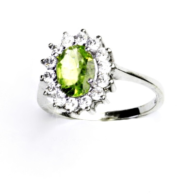 Zlatý prsten Kate, přírodní olivín a čiré zirkony, bílé i žluté zlato T 1507