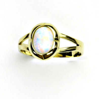 Zlatý prsten zdobí syntetický opál velikosti 8 x 6 mm.