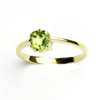 Prstýnek ze žlutého zlata je zdoben přírodním olivínem ve tvaru srdíčka o rozměru 6 x 6 mm.